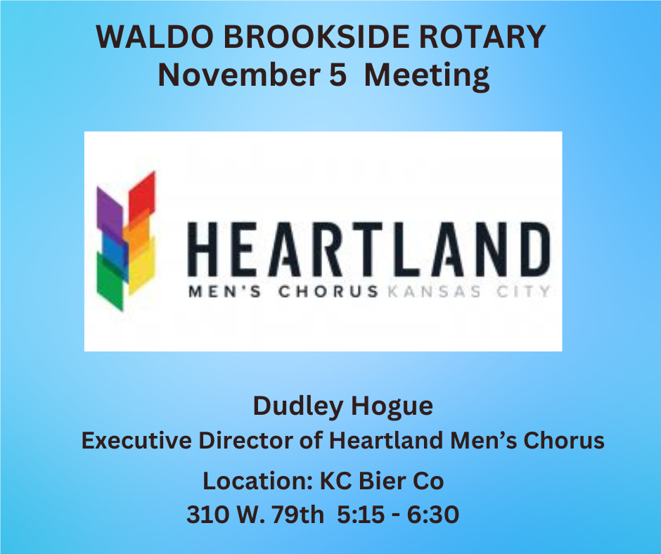 Our speaker on November 5 will be Dudley Hogue, Executive Director of the Heartland Men’s Chorus. Dudley will speak to the group about the 40-year history of the club, what they are doing now, and what's on tap for the upcoming season. Join us at KC Bier Co at 310 W. 79th Street. Waldo-Brookside meetings are open to all! Come find out about our club and this local organization!! Social time at 5:15, meeting starts at 5:30 and concludes at 6:30. #TheBestPlaceToBeOnAWednesdayNight